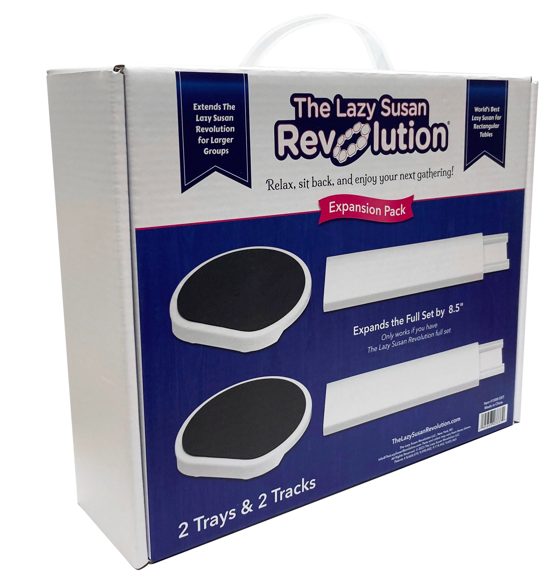 An 8.5" EXTENSION that extends the Lazy Susan Revolution - Full Set (sold separately). Buy as many as you need to fit any size/length table. 6-7' table = 1 Expansion pack + 1 Lazy Susan Revolution Full Set 7-8' table = 2 Expansion packs + 1 Lazy Susan Revolution Full Set Pass Food easily from one end of the table to the other, while sitting in your seat. No need to get up or ask someone to pass it to you.